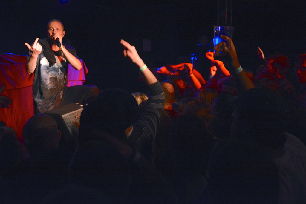 Wasting no time at all, Ant and Plain Ole Bill spun the crowd right onto Lake Street, literally. The house lights went black and a piano-driven beat dropped. Slug emerged from the corner of the eerie lit stage–stepping into Hell possibly? Or maybe a little North of it? You be the judge: