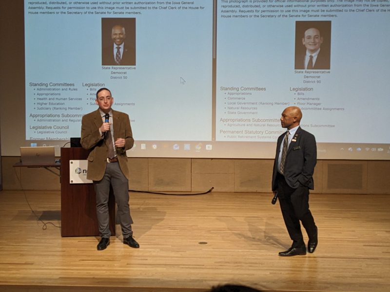 Here comes Ross Wilburn, a social work alumni of the University of Iowa and House Representative for the Story County District, alongside Johnson County Representative Adam Zabner. They’re here to answer questions, and oh boy are there a lot of them. I question Zabner about the progress of Senate File 2293 regarding the abolishment of the Iowa City Historical Society Building, asking “Where are the court proceedings and decisions at, and when can we expect the day for voting,” and though he gives a very descriptive assessment of the bill and what his future plans are, I don’t actually get a direct answer to my question. Should have been an easy one, considering Zabner is on the board supporting the continued funding of the Iowa City location.