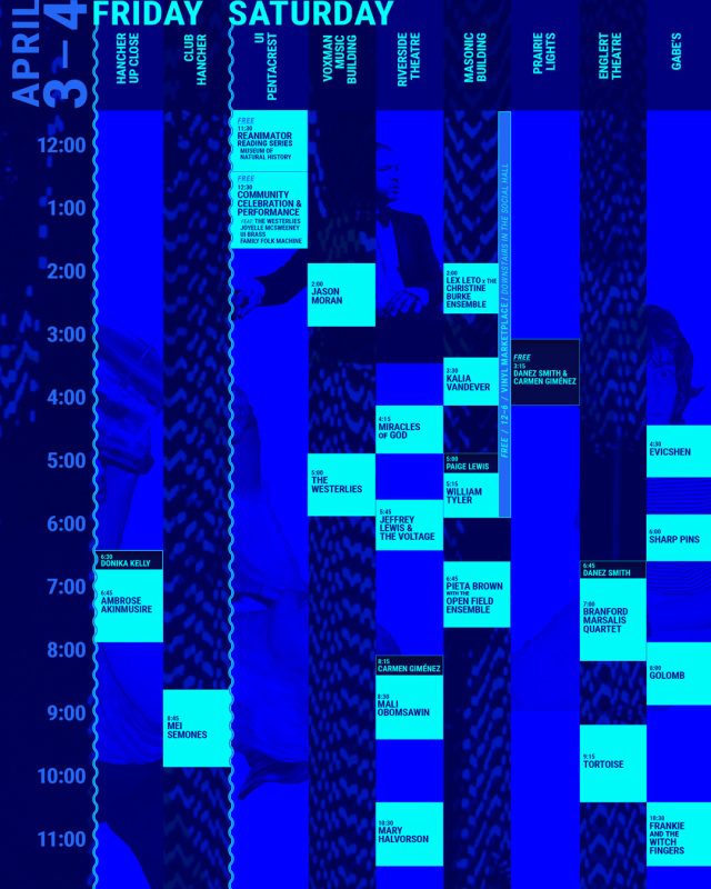 A new festival produced by Hancher Auditorium is taking place in Iowa City this weekend. Stop/Time Festival celebrates contemporary musicians and interdisciplinary arts this Friday and Saturday, a “festival of discovery—opening our ears and minds to new sounds, ideas, and possibilities.” Between jazz, folk, contemporary classical, psychedelia, ambient, and electronic musicians performing this weekend, the music spans a massive range of sound. Between music performances, poets and authors will be hosting readings, activations, and collaborations weaving between the arts, including KRUI’s own Elizander Espenschied of the Laughing Lyre. There’s something for everyone within this eccentric lineup, and our KRUI team covers a few standout events taking place that have caught our eye.