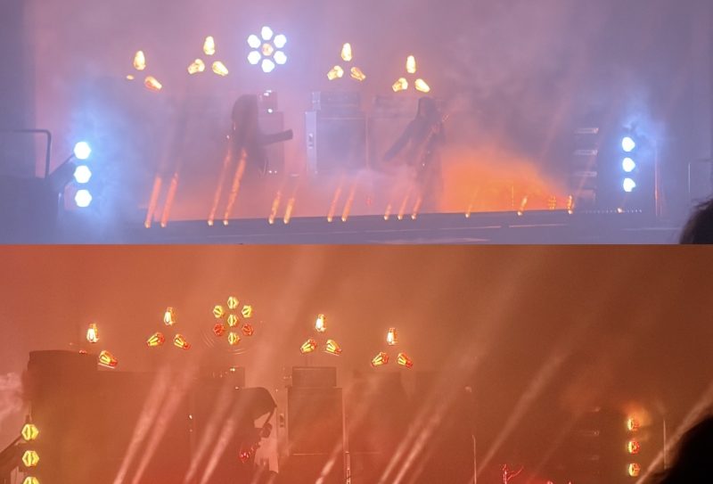 Densley was loud of course, but nothing could’ve prepared me for the sensation I experienced once sunn O))) finally took the stage. Through a heavy cloud of fog produced by fog machines off stage, and deep red stage lights, O’Malley and Anderson came on stage in their signature black robes. The crowd cheered after the long wait, and only stopped when both performers strummed a chord out on their guitars – a chord so loud that you could feel the sound waves rattle throughout your entire body. I cannot stress enough the power that each of their guitar strums had–it is not only that you felt the vibrations of sound throughout your whole body, but that it was truly unescapable. You could feel your chair, the walls, the ground, all rattling to their blaring music.